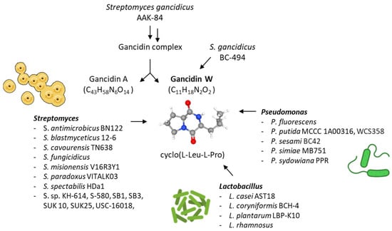 Microorganisms producing cyclo(L-Leu-L-Pro) or gancidin W and associated bioactivities.
