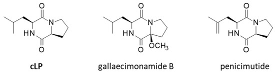 cLP has been identified in bacterial fractions from the species Staphylococcus xylosus VITURAJ10 isolated from goat milk and shown to inhibit bacterial pathogens such as S. aureus and E. coli. In this case, the product was designated PPDHMP (for pyrrolo[1,2α]pyrazine-1,4-dione,hexahydro-3-(2-methylpropyl)) [47,48,49]. The same product PPDHMP has been isolated from a few other bacterial species, notably Bacillus sp. VITLTMJ4 [50], Burkholderia seminalis JRBHU6 [51], Staphylococcus sp. MB30 [52], and Nocardiopsis sp. GRG1 [53]. Actually, the denomination cyclo(L-Leu-L-Pro) is more frequently used than gancidin W or PPDHMP, but it is the same compound. Cyclo(L-Leu-L-Pro) has been found in the Gram-positive bacterium Lactobacillus plantarum LBP-K10 [54,55,56], Gram-negative bacterium Pseudomonas sesami BC42 [57], in extracts of Streptomyces misionensis V16R3Y1 [58], in Lactobacillus coryniformis BCH-4 [59], and in other microorganisms, including lactic acid bacteria present in Bulgarian yogurt, for example [60] (Table 1). Cyclo(Leu-Pro) displays marked antibacterial properties, with activities reported against both Gram-positive (B. subtilis, S. aureus) and -negative (E. coli, S. typhimurium) bacteria. Interestingly, the compound is also active against multidrug-resistant strains, such as S. aureus 11471 and S. typhimurium 12219c, with a level of activity significantly superior to that of the DKP cyclo(Phe-Pro) (MIC = 17.28 and 46.22 mg/mL, respectively, against S. aureus 11471) [61].