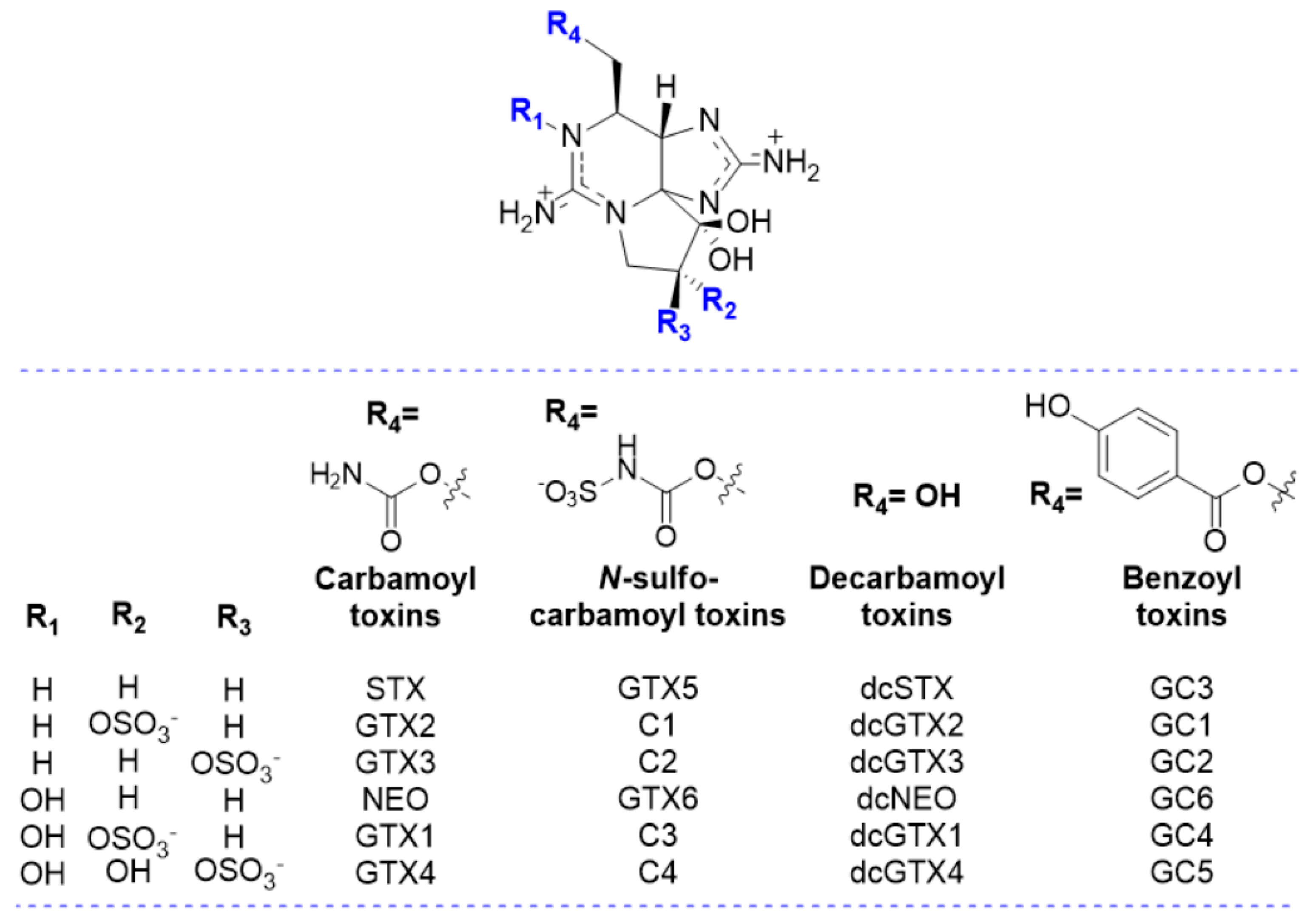 - Leal, J.F.; Cristiano, M.L.S. Marine Paralytic Shellfish Toxins: Chemical Properties, Mode of Action, Newer Analogues, and Structure–Toxicity Relationship. Nat. Prod. Rep. 2022, 39, 33–57. [Google Scholar] [CrossRef]