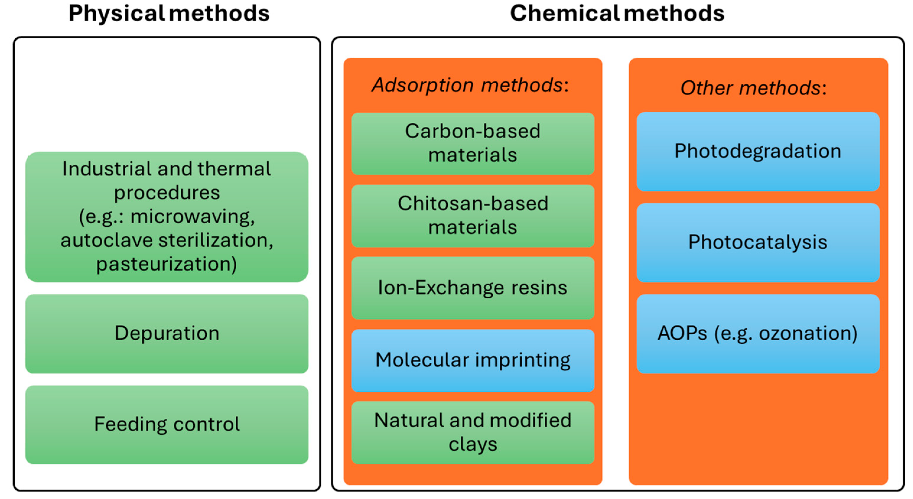 (Natural) depuration | Natural process. Suitable for live bivalves. It can be accelerated by the presence of non-toxic food. | It takes weeks to months depending on several factors such as species, toxin concentration, environmental conditions, etc. Increase in excreted by-products resulting from food supply. | Combine with other methods, such as adsorption, photodegradation or photocatalysis, to accelerate the detoxification process. |