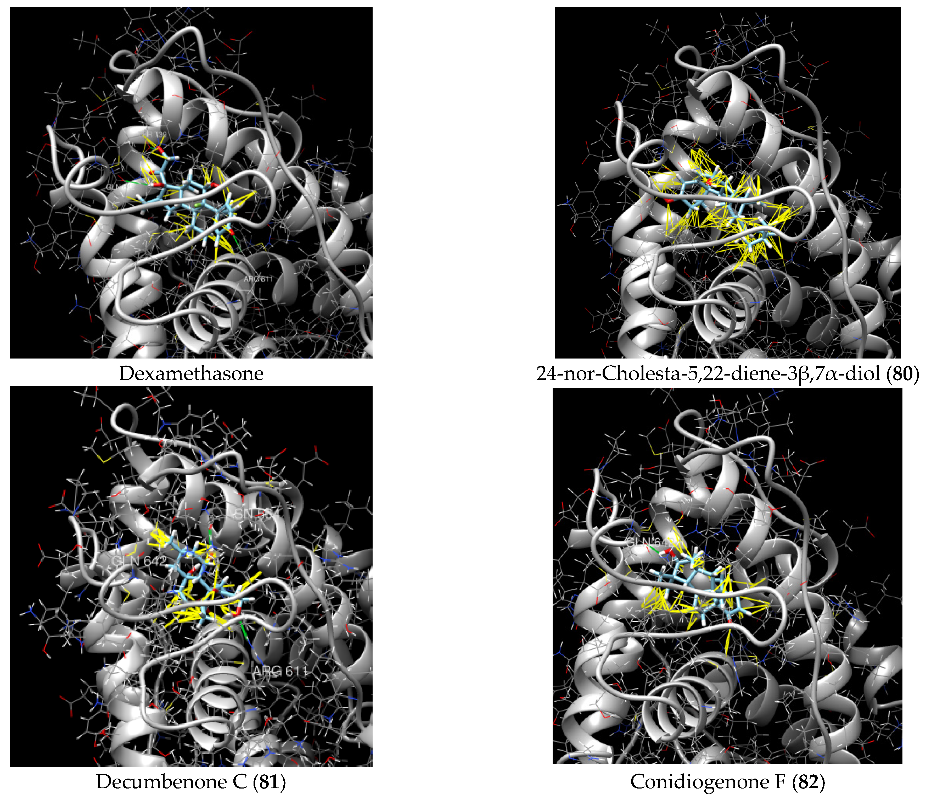 | 41 | Fucosterol | ![]() | Green algae Tydemania expeditionis | Hydrophobic interaction with GR via Leu563, Phe623, Leu608, and Met604 (molecular docking analysis) | [143] |