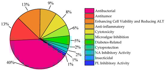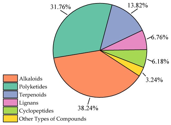 Against this backdrop, this study reviews the literature on new natural products derived from marine Aspergillus over the past three years, collating 340 new natural products from 81 articles that were first reported to originate from marine Aspergillus. In subsequent chapters, these 340 compounds are classified into six categories based on their structural characteristics: alkaloids, polyketides, terpenoids, lignans, cyclopeptides, and other types of compounds. The proportion of each type of compound is shown in Figure 1.