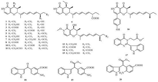 Wei-Chen Chen et al. isolated 16 undescribed pyranopyridone alkaloids, aculeapyridones A–P (1–16), from the co-culture extract of the mangrove-derived fungus Aspergillus aculeatinus WHUF0198 and the mangrove-associated Penicillium sp. DM27 through bioactivity-guided fractionation. Among them, compounds 12–15 with unique N-methoxy groups were identified as activated products of fungal co-culture. The hepatoprotective activity of these compounds against acetaminophen-induced acute liver injury was evaluated in vitro. Results showed that compounds 1–7, 9, 10, and 12–15 significantly increased cell viability and reduced alanine aminotransferase (ALT) levels in acetaminophen-treated mouse hepatocytes at 5.0 μM or 10.0 μM []. Additionally, Lai-Hui Dai et al. reported four new alkaloids (17–20) isolated from the culture of marine-derived Aspergillus fumigatus AF1 []. The structures of compounds 1–20 are shown in Figure 2.