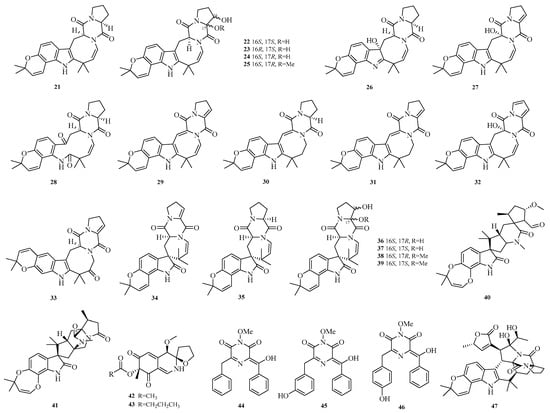 Philomina Panin Edjah et al. isolated two new paralectins (PHQ), aculeaquamides B and C (40–41), from the co-culture of mangrove-derived Aspergillus aculeatinus WHUF0198 and mangrove-associated Penicillium sp. DM27 []. Yao-Yao Zheng et al. studied the sea hare-derived fungus Aspergillus terreus RA2905 and identified two alkaloids, azasperones E and F (42–43) []. Sarani Kankanamge et al. cultured the Australian marine sediment-derived fungus Aspergillus noonimiae CMB-M0339 and obtained rare 2,6-diketopiperazine alkaloids noonazines A–C (44–46) []. Zheng-Biao Zou et al. isolated a rare stephacidin-asperochratide hybrid, stephaochratidin A (47), from deep-sea Aspergillus ochraceus. Activity assays showed that stephaochratidin A (47) significantly inhibited ferroptosis with an EC50 value of 15.4 μM, acting by downregulating heme oxygenase 1 (HMOX-1) expression and suppressing lipid peroxidation []. The structures of compounds 21–47 are shown in Figure 3.