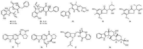 Geng-Si Zhang et al. isolated the new natural products secofumitremorgins C (55) and D (56) from the salt pan-derived Aspergillus fumigatus GXIMD00544. Activity assays showed that compound 55 exhibited antifungal spore germination activity against Fusarium sacchari-related plant pathogenic fungi, with a 53.0% inhibition rate at 100.0 μM. Additionally, compound 55 demonstrated antifouling potential against Balanus amphitrite larval settlement, achieving a 96% inhibition rate at 100.0 μM []. Harol Ricardo Arias Cardona et al. reported an undescribed isoprenylated indole derivative, hydroxyhomamide (57), from the marine sponge-associated fungus Aspergillus fischeri MMERU 23 []. Bingying Tang et al. isolated a new ascandinine T (58) from the Antarctic sponge-derived fungus Aspergillus candidus HDN15-152 []. The structures of compounds 48–58 are shown in Figure 4.