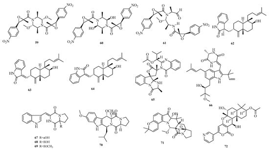 Yu Chen et al. isolated and identified a new derivative, aspertaichamide A (71), from the endophytic fungus Aspergillus taichungensis 299 derived from the marine red alga Gelidium amansii. In vitro cytotoxicity assays showed that new compound 71 reduced AGS cell viability in a concentration-dependent manner, with an IC50 value of 1.7 μM. Further studies indicated that 71 might induce programmed cell death in AGS cells via an apoptotic pathway []. Zhu Chen et al. obtained a new alkaloid, pyripyropene U (72), from the marine sponge-derived Aspergillus sp. SCSIO41420 []. The structures of compounds 59–72 are shown in Figure 5.