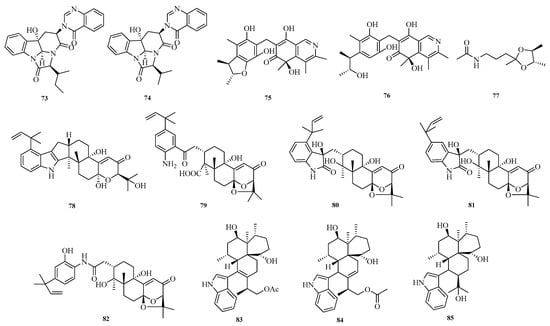 Fei Zhang et al. isolated and identified the fungus Aspergillus sp. ZF-104 from marine soft corals collected in Haikou Bay, China. Eight undescribed indole-diterpenoid alkaloids, penerpenes O–V (78–85), were isolated and characterized from this strain. The inhibitory activity of these compounds against protein tyrosine phosphatase 1B (PTP1B) was evaluated. In the PTP1B inhibition assay, compounds 78, 79, and 84 showed activities comparable to that of the positive control []. The structures of compounds 73–85 are shown in Figure 6.