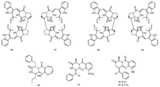 Ying-Jie Zhao et al. obtained two pairs of new dimeric diketopiperazine alkaloids, (±)-dibrevianamides Q1 and Q2 ((±)-1 and (±)-2) (86–89), from marine-derived Aspergillus sp. Activity assays showed that compounds 86 and 89 exhibited resistance to H1N1 virus with half-maximal inhibitory concentration (IC50) values of 12.6 and 19.5 μM, respectively. Compound 86 also demonstrated significant activity against Mycobacterium tuberculosis with a minimum inhibitory concentration (MIC) of 10.2 μM []. Qi Hong et al. conducted a secondary metabolite study on the filamentous fungus Aspergillus puniceus FAHY0085 isolated from a South China Sea coral sample, isolating four undescribed alkaloids, including an oxyepin-containing diketopiperazine-type alkaloid (90) and three 4-quinazolone alkaloids (91–93). The transcriptional activation of liver X receptor α (LXRα) by the isolated compounds was evaluated. Results showed that the new diketopiperazine puniceloid F (92) exhibited significant transcriptional activation activity against LXRα with half-maximal effective concentration (EC50) values ranging from 2.0 to 15.0 μM []. The structures of compounds 86–93 are shown in Figure 7.