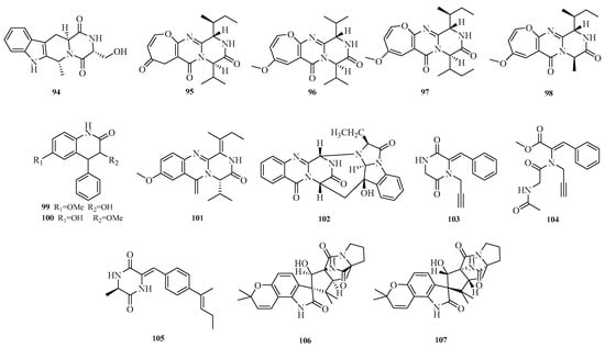 Jun-Qiu Mao et al. studied the marine-derived fungus Aspergillus sclerotiorum ST0501 from the South China Sea, from which three new alkaloids, sclerotioloids A–C (103–105), were obtained. Sclerotioloid B (104) showed inhibition of LPS-induced NO production, with an inhibition rate 28.9% higher than that of dexamethasone (25.9%) []. Jin-Shan Hu et al. isolated two new indolediketopiperazine alkaloids (IDAs), namely (+)-19-epi-sclerotiamide (106) and (−)-19-epi-sclerotiamide (107), from the epiphytic fungus Aspergillus versicolor CGF9-1-2 associated with soft corals []. The structures of compounds 94–107 are shown in Figure 8.