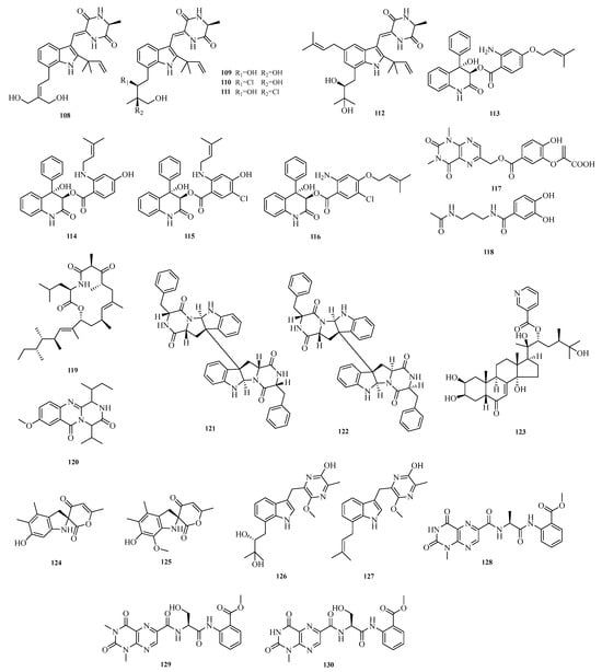 Li-Hong Yan et al. isolated and characterized five new antibacterial indolediketopiperazine alkaloids from a deep-sea cold seep-derived Aspergillus chevalieri, namely 24,25-dihydroxyvariecolorin G (108), 25-hydroxyrubrumazine B (109), 22-chloro-25-hydroxyrubrumazine B (110), 25-hydroxyvariecolorin F (111), and 27-epi-aspechinulin D (112). Activity assays showed that compounds 108–112 exhibited inhibitory activity against various pathogens with minimum inhibitory concentration (MIC) values ranging from 4.0 to 32.0 μM []. Zhibo Hu et al. isolated and identified six new benzoic acid-containing alkaloids from seagrass-derived Aspergillus candidus, namely asperalins A–D (113–116), asperaluhalazine A (117), and N-(3-acetamidopropyl)-3,4-dihydroxybenzamide (118). Compounds 115 and 116 showed strong activity against Staphylococcus aureus, Streptococcus iniae, and Streptococcus parauberis, with MIC values of 10.1, 5.0 and 10.1 μM, respectively [].