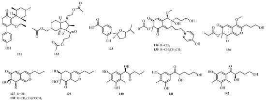 Wei-Chen Chen et al. isolated one undescribed polyketide, aculeapyridones Q (131), from the co-culture extract of mangrove-derived fungus Aspergillus aculeatinus WHUF0198 and mangrove-associated fungal Penicillium sp. DM27 via bioactivity-guided fractionation []. Yue Jiang et al. isolated asperhydrindane A (132) from the mangrove-derived fungus Aspergillus terreus GXIMD 03,158 []. Xu-Meng Ren et al. isolated (7R,10R)-11-dehydroxy-iso-10-hydroxysydowic acid (133) from the deep-sea-derived fungus Aspergillus sydowii DFFSCS007 []. Yao-Yao Zheng et al. conducted a study on the sea hare-derived fungus Aspergillus terreus RA2905, identifying nine new polyketide compounds, namely azasperones C–D, G–J (134–139) and preazasperones A–C (140–142) []. The structures of compounds 131–142 are shown in Figure 10.