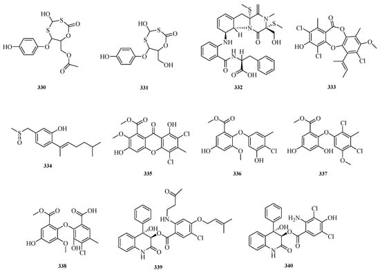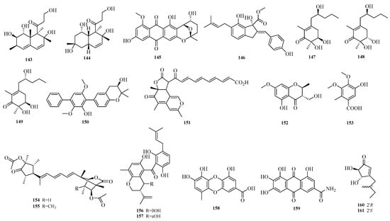Zhibo Hu et al. isolated one chromone (152) and one benzoic acid derivative (153) from the seagrass-derived Aspergillus alabamensis SYSU-6778 []. Yura Ha et al. obtained emericelactones F and G (154–155), 20R,25S-preshamixanthone (156), 20R,25R-preshamixanthone (157), aspergilol G (158), and 2-hydroxyemodic amide (159) from the marine sediment-derived Aspergillus sp. ZZ1861. Aspergilol G (158) and 2-hydroxyemodic amide (159) exhibited antifungal activity against Candida albicans with minimum inhibitory concentration (MIC) values of 1.6 and 3.1 μM, respectively []. Guang-Yu Zhang et al. identified terreins A and B (160–161) from the coral-derived fungus Aspergillus terreus []. The structures of compounds 143–161 are shown in Figure 11.