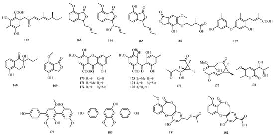 Yanbo Zeng et al. obtained two undescribed compounds, asperterphenylcins A–B (179–180), and another two undescribed compounds, asperdiphenylcins A–B (181–182), from the marine-derived fungus Aspergillus candidus HM5-4 isolated from a South China Sea sponge. Activity assays showed that compound 179 exhibited strong inhibitory activity against Neoscytalidium dimidiatum, with an inhibition zone diameter of 31.7 ± 2.6 mm at a concentration of 10.0 μg/disk; compound 180 displayed potent inhibitory activity against α-glucosidase, with an IC50 value of 1.3 ± 0.2 μM []. The structures of compounds 162–182 are shown in Figure 12.