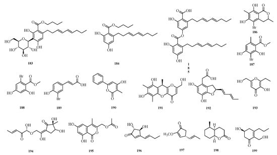 Chao Li et al. conducted a study on the starfish-derived fungus Aspergillus sp. WXF1904, isolating one new brominated isocoumarin, namely 5-bromo-6,8-dihydroxy-3,7-dimethylisocoumarin (186), as well as four new natural products: methyl 3-bromo-2,4-dihydroxy-6-methylbenzoate (187), methyl 2-bromo-4,6-dihydroxybenzoate (188), (E)-3-(3-bromo-4-hydroxyphenyl)acrylic acid (189), and 4-hydroxy-3-methyl-6-phenyl-2H-pyran-2-one (190). Evaluation of the acetylcholinesterase and pancreatic lipase inhibitory activities of these compounds showed that the new compound 186 exhibited weak inhibitory activity against acetylcholinesterase, while compounds 187 and 190 displayed weak inhibitory activity against pancreatic lipase [].