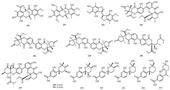 Yuanli Li et al. successfully obtained seven new phenolic bisabolane sesquiterpenoids (208–214) from the deep-sea-derived fungus Aspergillus versicolor YPH93. Evaluation of the effects of all compounds on ferroptosis showed that compound 214 exerted an inhibitory effect on erastin/RSL3-induced ferroptosis, with a half-maximal effective concentration (EC50) in the range of 2.0 to 4.0 μM []. The structures of compounds 200–214 are shown in Figure 14.