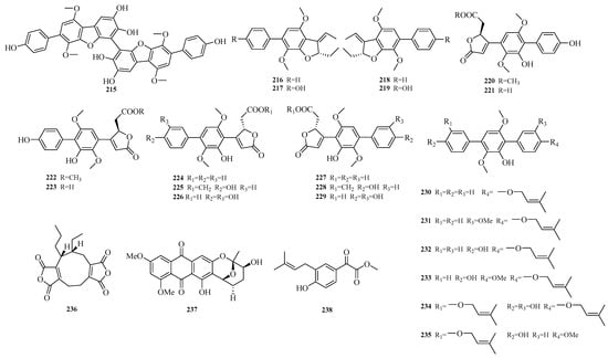 Structural diagrams of compounds 215–238.