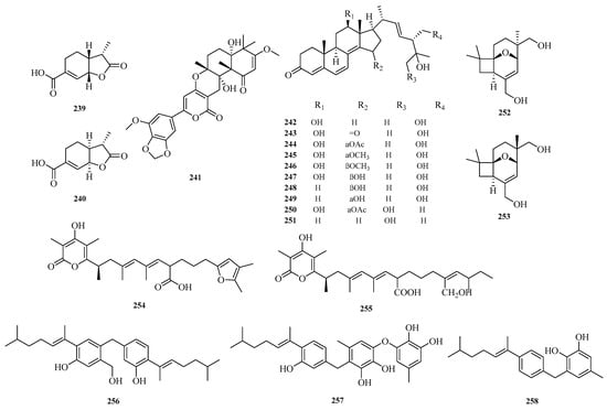 Yiwei Hu et al. isolated two new 6-alkenyl pyrone polyketides, alternapyrones G-H (254–255), from the marine-derived fungal strain Arthrinium arundinis. Activity assays revealed that alternapyrone G (254) not only inhibited M1 polarization in lipopolysaccharide (LPS)-stimulated BV2 microglia but also promoted dendritic regeneration and neuronal survival after Aβ treatment. This indicates that compound 254 has the potential to serve as a privileged scaffold for the development of anti-Alzheimer’s disease drugs []. Hao-Yu Yu et al. isolated a rare dimeric aromatic bisabolane sesquiterpenoid, aspergol A (256), and two undescribed phenolic bisabolane sesquiterpenoids, expansol H and aspergol B (257–258), from the marine sediment-derived Aspergillus sp. MCCC 3A00392 []. The structures of compounds 239–258 are shown in Figure 16.