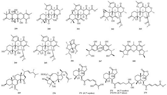 Sheng-Tao Fang et al. conducted a chemical investigation on the marine alga-derived strain Aspergillus sp. RR-YLW-12, identifying six new terpenoids: 21-Deoxo-21-hydroxyophiobolin U (270) and ustusolates K–O (271–275). The growth inhibitory effects of all compounds against five species of harmful marine microalgae were evaluated. The new compounds exhibited significant to moderate inhibitory effects on all tested microalgal species, with IC50 values ranging from 5.8 to 54.5 μM []. The structures of compounds 259–275 are shown in Figure 17.