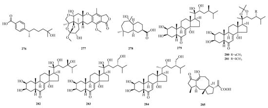 Siwen Niu et al. isolated a new sesquiterpenoid, malfilanol C (278), from the deep-sea-derived fungus Aspergillus puniceus A2. Compound 278 exhibited weak antibacterial activity against Staphylococcus aureus ATCC 29,213 []. Zhong-Hui Huang et al. isolated six previously undescribed compounds, punicesterones B–G (279–284), from the deep-sea-derived fungal strain Aspergillus puniceus SCSIO z021. Punicesterones B and C (279–280) showed cytotoxicity and could reduce intracellular lipid accumulation. Additionally, antibacterial activity assays indicated that compounds 279–280 exhibited moderate antibacterial activity against five bacterial strains [].
