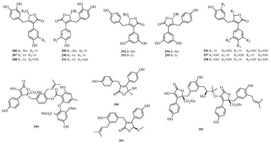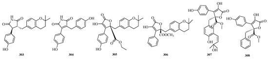 Zheng-Biao Zou et al. isolated 13 new minor furanones, including 5 pairs of enantiomers, namely (±)-nigenolides A–E (286–295) and racemic nigenolides F–H (296–298), from the deep-sea-derived Aspergillus niger 3A00562. Activity assays revealed that compounds 288, 292–293, and 297 could inhibit RSL3-induced ferroptosis. Among them, compound 297 exhibited half-maximal effective concentrations (EC50) of 0.8 μM and 0.7 μM against ferroptosis in A375 and 786-O cells, respectively. Studies indicated that compound 297 is a potential iron chelator and free radical-scavenging antioxidant, and it exerts its ferroptosis-inhibiting effect by downregulating the expression of the TXNIP gene [].