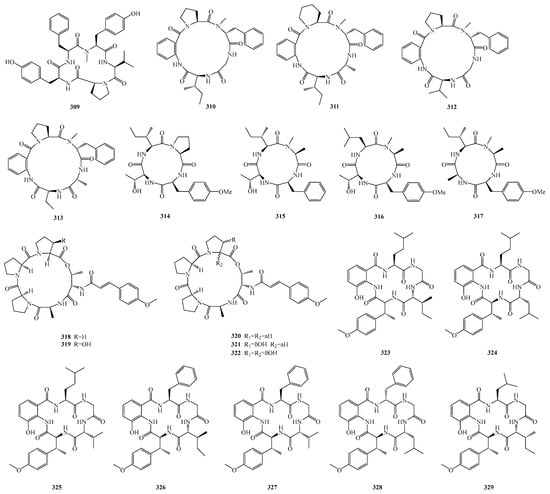 Florent Magot et al. isolated 77 microbial strains from the seafloor at a depth of 2454 m in the Fram Strait, Arctic Ocean. Using the one-strain-many-compounds (OSMAC) cultivation method, they isolated a new polyketide synthase-nonribosomal peptide synthetase (PKS-NRPS) hybrid macrolide, heteroamidin A (119), and a new quinazoline, (−)-isocarbonolide A (120) []. Xinyang Li et al. isolated two new dimeric diketopiperazine stereoisomers (121–122) from the culture broth of an Aspergillus strain derived from the intestine of Lip Tarico []. Zhong-Hui Huang et al. isolated one previously undescribed compound, punicesterones A (123), from the deep-sea-derived fungal strain Aspergillus puniceus SCSIO z021 [].