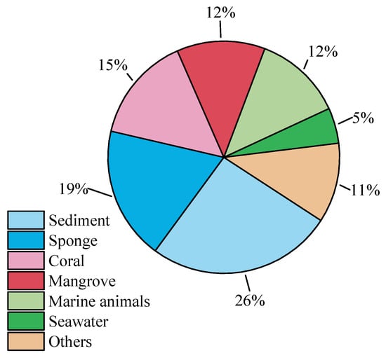Aspergillus sp., a representative group of marine fungal ecosystems, primarily thrives in typical marine habitats such as mangrove humus substrates, coral reef symbiotic systems, and deep-sea sediments []. Its adaptation mechanisms involve systematic responses to extreme physical and chemical conditions, including high osmotic pressure, high hydrostatic pressure, and low dissolved oxygen concentration []. Under such selective pressures, marine Aspergillus has evolved secondary metabolic pathways distinct from those of its terrestrial relatives through horizontal gene transfer and metabolic network reconstruction, leading to the production of unique natural products []. Statistics show that Aspergillus fungi are the most studied species among marine microbial-derived new natural products, accounting for 31% of new natural products from marine fungi []. These marine natural products exhibit rich chemical diversity, thus facilitating the discovery of drug lead compounds.