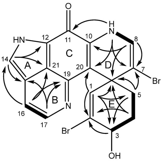 Discorhabdophenone B (5) differed from the previously presented discorhabdins herein due to the presence of a sulphur atom in the molecular formula; however, a C-5/C-8 sulphur bridge is a common feature among discorhabdin derivatives. Additional differences were the presence of three deshielded methines and the absence of the bromine atom, identified by the lack of a 1:1 isotopic pattern in the mass spectrum (Figure S36), and the presence of two extra deshielded quaternary carbons. The two deshielded methines H-1 (δH 4.84) and H-2 (δH 5.02) had COSY correlation to each other, with H-1 being identified as an oxymethine due to COSY correlation between the exchangeable δH 6.75 (OH-1) and H-1. H-2 displayed HMBC correlations to deshielded C-1 (δC 67.2), C-3 (δC 184.5), C-6 (δC 47.5), and C-17 (δC 131.5). H-4 (δH 5.96) had HMBC correlations to C-2 (δC 65.7), C-5 (δC 171.3), and C-6, identifying ring E, as shown in Figure 3, with a ketone on C-3, Δ4 olefin, and an open valence on C-2 and C-5.