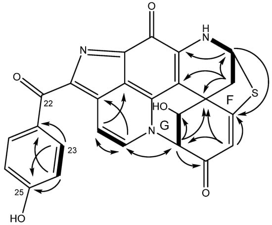 Discorhabdophenone B (5) was isolated with a m/z of 470.0810 (HRESIMS, [M + H]+) and a molecular formula of C25H15N3O4S, corroborated by the 1H and 13C NMR data (Table 2). Structure elucidation was completed by COSY and HMBC correlations (Figure 3) and comparison with known discorhabdin derivatives. The compound was identified as a discorhabdin due to the C-6 spiro-center (δH 47.5) and the C-11 carbonyl (δC 168.7). The 1H NMR data indicated that 5 had a p-substituted phenyl ring, two additional aromatic protons, four deshielded methines, and one methylene.