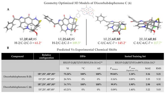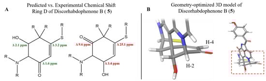 (A) Predicted vs. experimental chemical shifts in possible regioisomers of discorhabdophenone B (5) measured in delta ppm. (B) 3D model of geometry-optimized conformer of discorhabdophenone B (5) showing H-2 and H-4 are in the same plane of ring D.