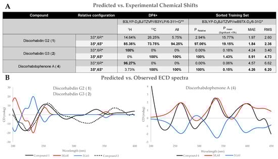 (A) DP4+ and STS probabilities from comparing experimental and DFT-predicted chemical shift in relative configurations of compounds 1, 2, and 4, with results indicating 3S*,6S* configuration. (B) Experimental vs. observed ECD spectra of 1, 2, and 4. Spectra were predicted and measured in methanol.