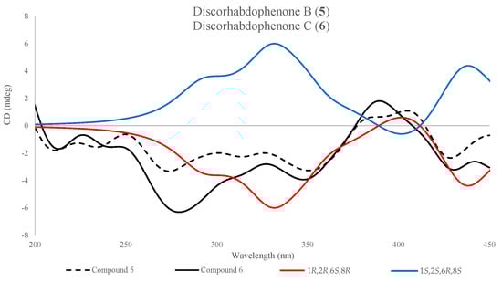 The absolute configuration of compounds 1, 2, and 4–6 was determined by a comparison of experimental Electronic Circular Dichroism (ECD) and simulated ECD spectra using time-dependent density functional theory (TD-DFT), predicted at a B3LYP-D3/CC-PVDZ// B3LYP-D3/CC-PVDZ level using a PCM solvation model. Compounds 5 and 6 were assigned an absolute configuration of 1S,2R,6S,8R (Figure 7), while 1, 2, and 4 were assigned 3R,6R (Figure 5B). It is worth noting that the predicted spectra of 1 and 2 required a scaling factor of 0.65 to accurately match the experimental ECD spectra.