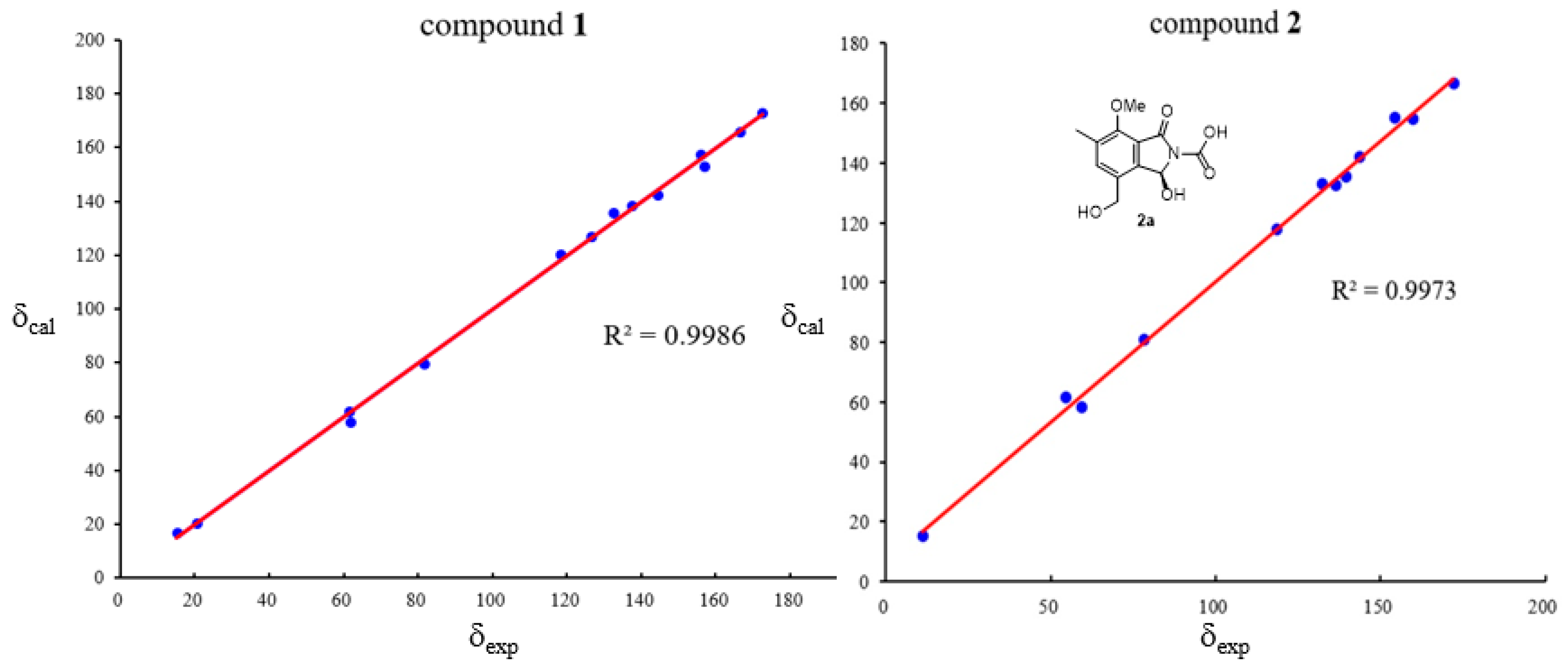 - Fujita, M.; Yamada, M.; Nakajima, S.; Kawai, K.; Nagai, M. O-Methylation effect on the carbon-13 nuclear magnetic resonance signals of ortho-disubstituted phenols and its application to structure determination of new phthalides from Aspergillus silvaticus. Chem. Pharm. Bull. 1984, 32, 2622. [Google Scholar] [CrossRef]