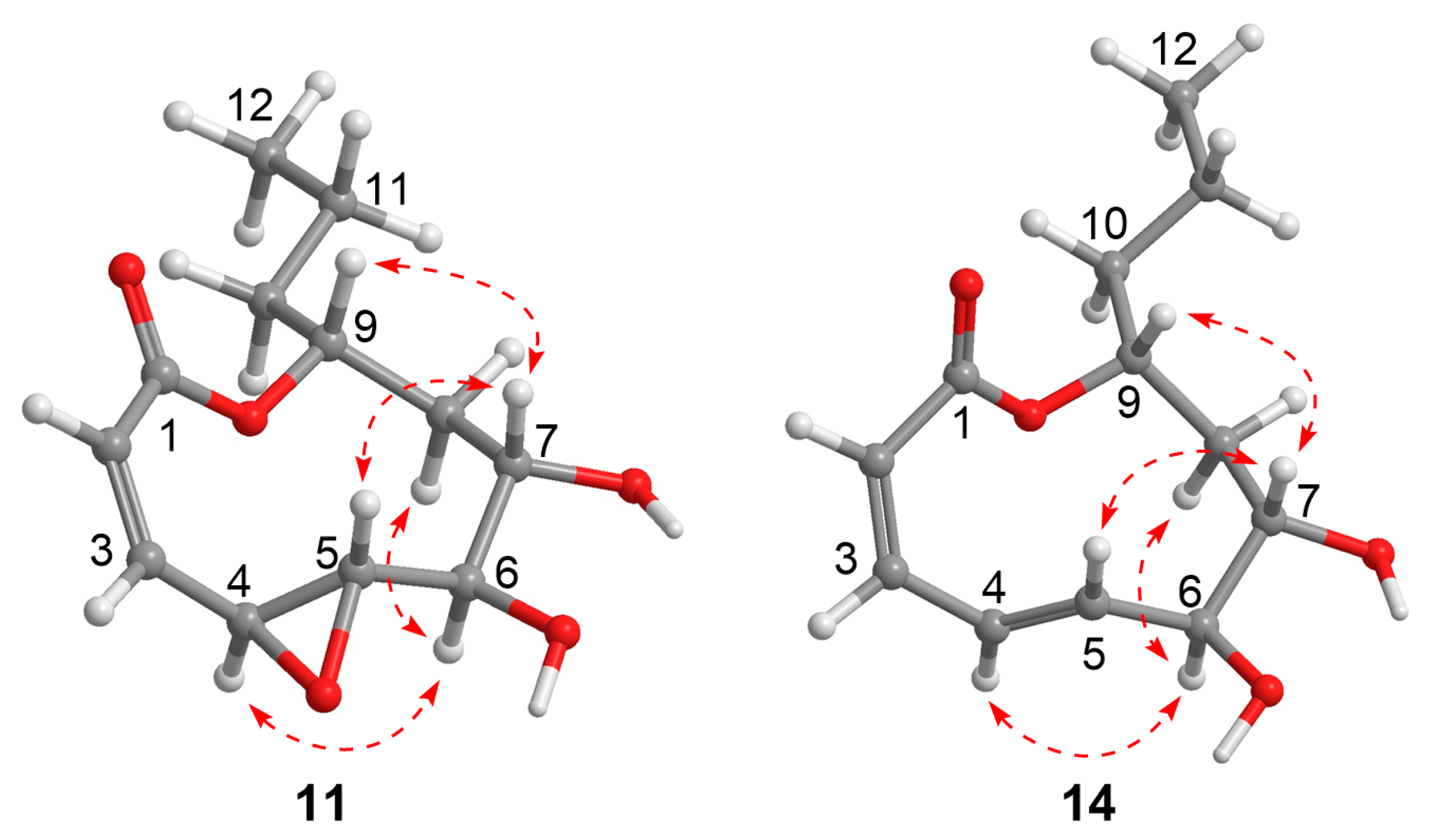 | 2 | 5.96, d (11.0, 1.5) | 126.0, CH | 5.65, d (11.4) | 118.9, CH | 2.43, m | 34.4, CH2 | 5.91, d (10.6) | 126.3, CH | 40.8, CH2 | 28.4, CH2 |