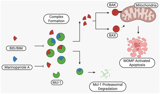 The naturally occurring marinopyrroles and pyrrolomycins have primarily been studied for their potential role as BH3-mimetics, compounds that mimic the function of pro-apoptotic BH3-only proteins such as BIM, BID, PUMA, and NOXA. These BH3-only proteins represent a distinct subclass of the Bcl-2 family that contains only the BH3 domain, which is sufficient to initiate pro-apoptotic signaling. Under normal conditions, they serve as critical triggers of apoptosis but are often neutralized by anti-apoptotic proteins, including Mcl-1, Bcl-2, Bcl-xL, and Bcl-W. Many cancers exploit this mechanism by overexpressing anti-apoptotic proteins to evade apoptosis [31,32]. BH3-mimetics restore apoptotic potential by disrupting inhibitory complexes formed when anti-apoptotic proteins sequester BH3-only proteins in their hydrophobic binding grooves. By competitively binding to these grooves, BH3-mimetics release BH3-only proteins, enabling them to activate the pro-apoptotic effectors BAX and BAK. Once activated, BAX and BAK induce mitochondrial outer membrane permeabilization, which releases pro-apoptotic factors and initiates the cascade of events that culminates in apoptotic cell death [33].