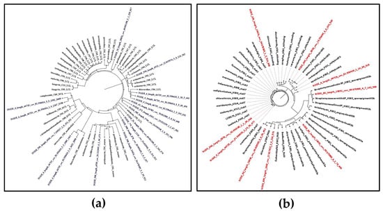 Maximum likelihood phylogenetic tree of non-ribosomal peptide (C domains) and polyketides (KS domain) detected by NAPDoS against the NaPDoS domain database: (a) C domains—domains from this Streptomyces isolate are colored blue; (b) KS domains—domains from this Streptomyces isolate are colored red.
