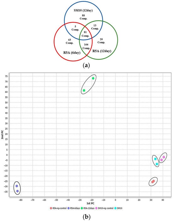 Metabolites of the S. tunisiensis isolate: (a) unique and common metabolites after growth in R5A and SM10 media; (b) two-dimensional plot of metabolites produced in SM10 and R5A media by PCA.