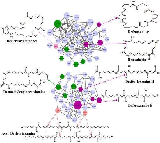 Desferrioxamine subnetwork by GNPS presented by the node and the edge graph produced by S. tunisiensis: purple nodes represent potential deferoxamine and bisucaberin; pink and green nodes represent desferrioxamine derivatives that were annotated using MS/MS data; GNPS cosine cutoff, 0.7.