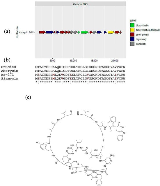 Aborycin, one of the secondary metabolites predicted in the Streptomyces tunisiensis isolate: (a) biosynthetic gene cluster for aborycin; (b) alignment of the predicted lassopeptide structure and most similar cluster products, aborycin and siamycin and MS-271; and (c) Aborycin chemical structure.