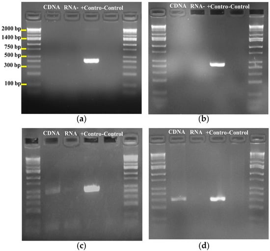 PCR amplicons of RIPPs from genomic DNA and cDNA of S. tunisiensis strain (a) Lanthipeptide node 6 size 389 bp; (b) Lanthipeptide node 71 size 440 bp; (c) lasso peptide node 54 amplicon size 459 bp; (d) Lassopeptide node 54 amplicon size 298 bp.