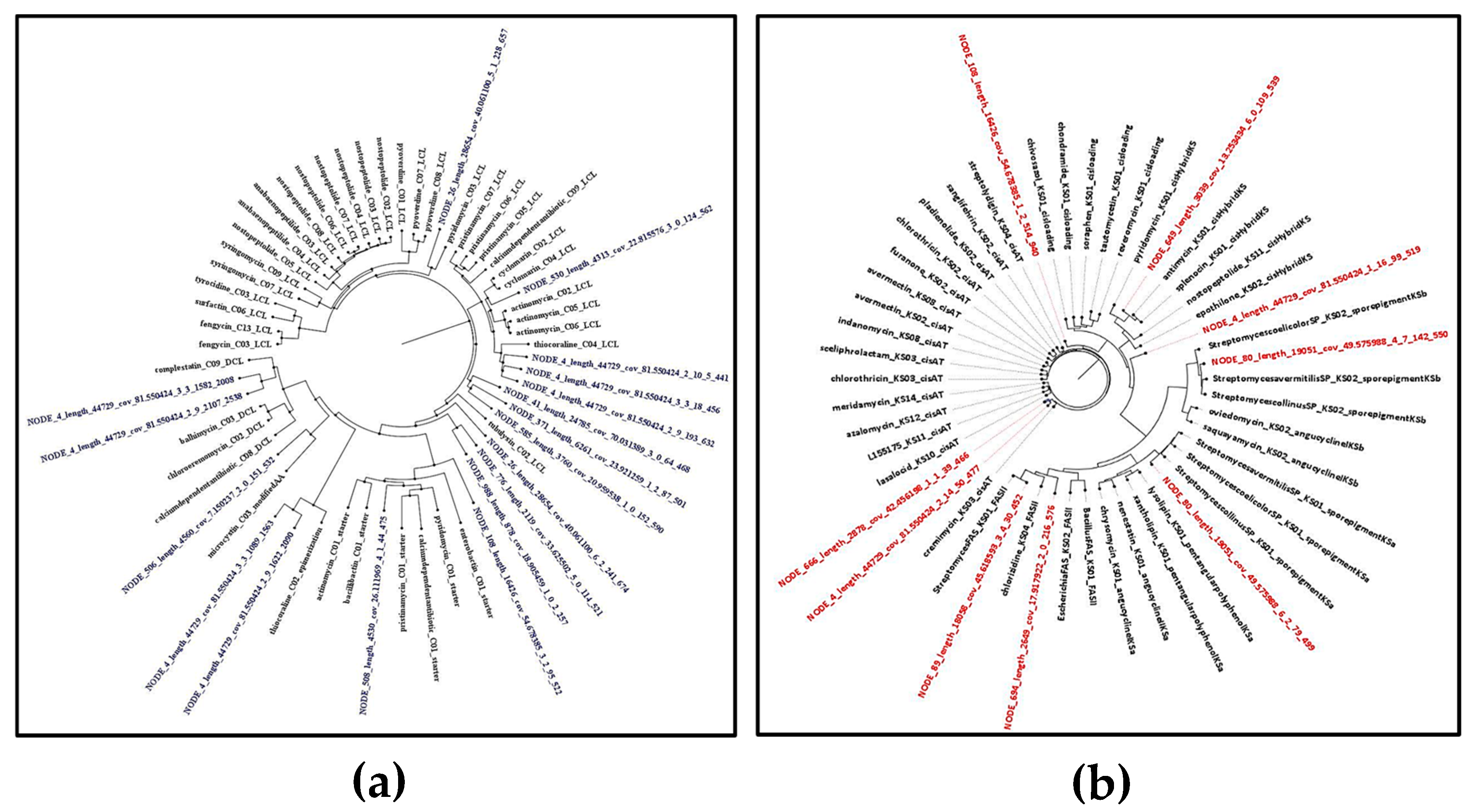 - Schorn, M.A.; Alanjary, M.M.; Aguinaldo, K.; Korobeynikov, A.; Podell, S.; Patin, N.; Lincecum, T.; Jensen, P.R.; Ziemert, N.; Moore, B.S. Sequencing rare marine actinomycete genomes reveals high density of unique natural product biosynthetic gene clusters. Microbiology 2016, 162, 2075–2086. [Google Scholar] [CrossRef]
