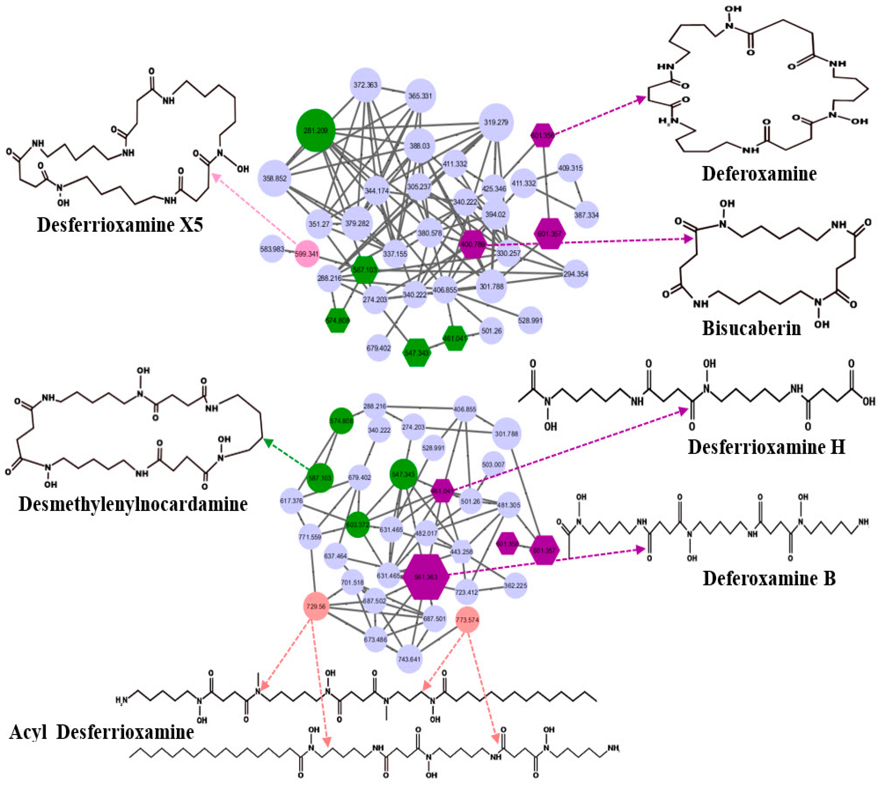 - Jarmusch, S.A.; Lagos-Susaeta, D.; Diab, E.; Salazar, O.; Asenjo, J.A.; Ebel, R.; Jaspars, M. Iron-meditated fungal starvation by lupine rhizosphere-associated and extremotolerant Streptomyces sp. S29 desferrioxamine production. Mol. Omics 2021, 17, 95–107. [Google Scholar] [CrossRef]