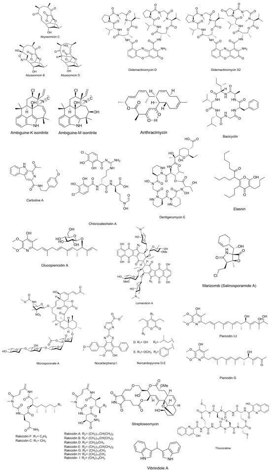In the following text, we report some examples of compounds of marine bacterial origin previously reported and deposited [36,54,55]. Table 1 reports examples of the most representative drugs or antibiotics produced by marine bacteria, while Figure 1 shows the molecular structure of main compounds. The only exceptions to this are Didemactinomycin D and Glucopiericidin A, not produced by marine bacteria but included for their scientific importance. The patents reported were retrieved from freely available databases such as Espacenet, Clarivate Analytics, Patbase, Questel Orbit, Google Patent, and Chemical Abstracts as suggested and reported by Banerjee et al. [55].