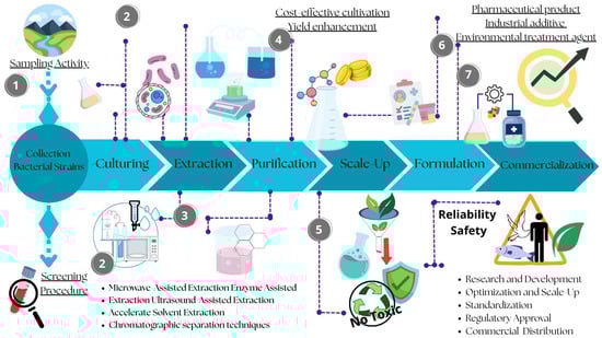 Marine bacteria have attracted particular interest in recent years due to their ability to grow in laboratory conditions, the potential to optimize biosynthetic processes and their rapid growth rate, which allows for more concrete applications. Unlike many synthetic compounds, these bacterial-derived metabolites are frequently biodegradable, exhibit low toxicity to non-target organisms, and align well with sustainability principles [16,25]. Moreover, using microorganisms as a source of products with biotechnological relevance also has the advantage of solving problems related to extensive sampling and the significant impact on higher organisms. It also guarantees sufficient yields for late pre-clinical and clinical development [26]. As a result, marine bacteria are increasingly recognized as optimal sources of novel natural products, and also ideal candidates for developing truly sustainable, effective and marine ecosystem-friendly solutions in the medical, industrial, and environmental fields.