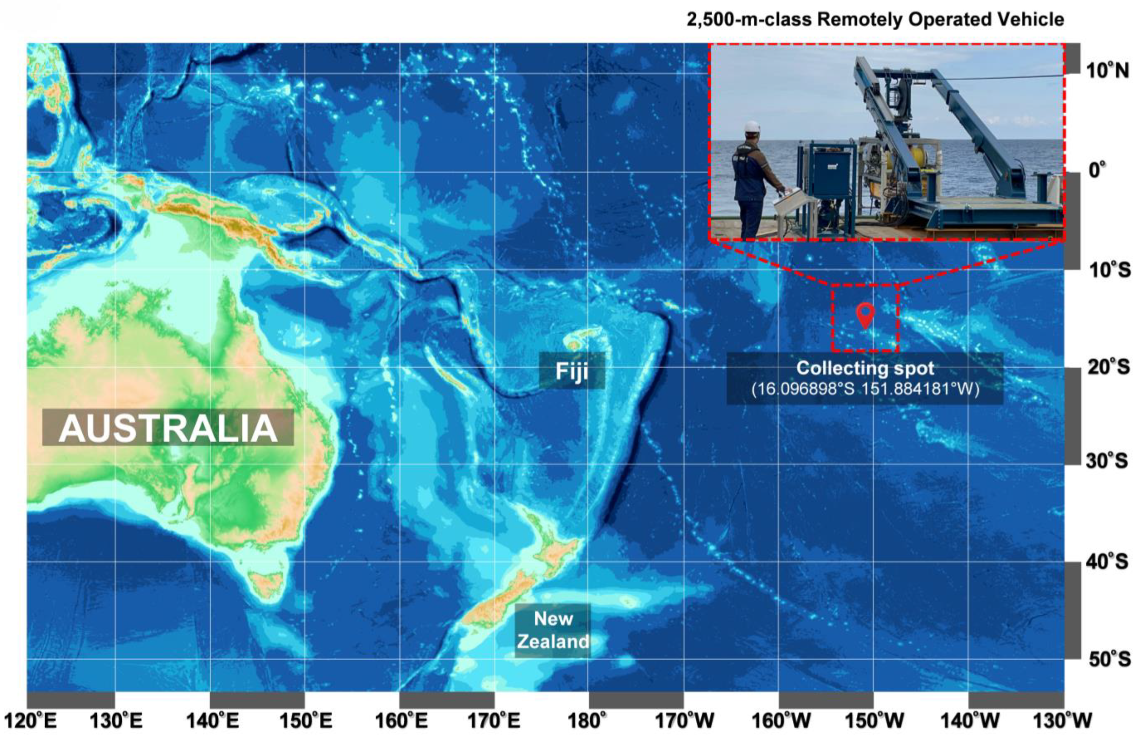 Figure 1). An underwater robot, a 2500 m class Remotely Operated Vehicle (URI-L, Redone Technologies Co., Ltd., Jangseong-gun, Republic of Korea), was used for sampling. The sediment samples were dried in air for 24 h on a clean bench and subjected to heat shock at 55 °C for 5 min to inhibit the growth of non-spore-forming bacteria. The sediment sample was suspended in sterile seawater, and a 100 μL aliquot of the sample was plated onto marine agar 2216 (Sigma-Aldrich Inc.). The plates were incubated at 27 °C for 1–3 months, allowing morphologically distinct colonies to develop. A single yellow-pigmented colony was selected, designated as strain ROD011, and purified by repeated subculturing on Marine Agar 2216 (