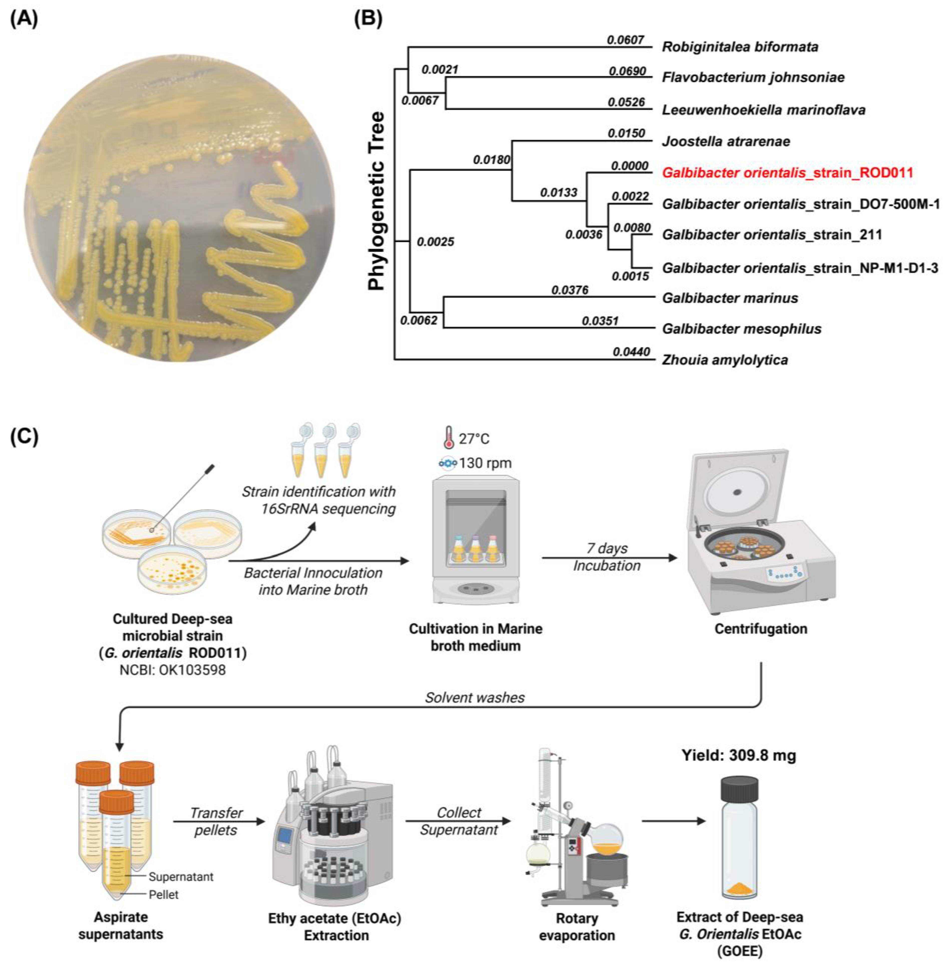 G. orientalis Strain ROD011 was cultivated at 27 °C in two 2.5 L Ultra Yield Flasks, each containing 1 L of medium, shaking at 130 rpm for seven days. The medium was composed of 10 g/L soluble starch, 2 g/L yeast extract, and 4 g/L peptone, dissolved in distilled water containing 34.75 g artificial sea salt. After the seven-day incubation period, the culture broth (2 L) was harvested by centrifugation (4 °C, 10,000×