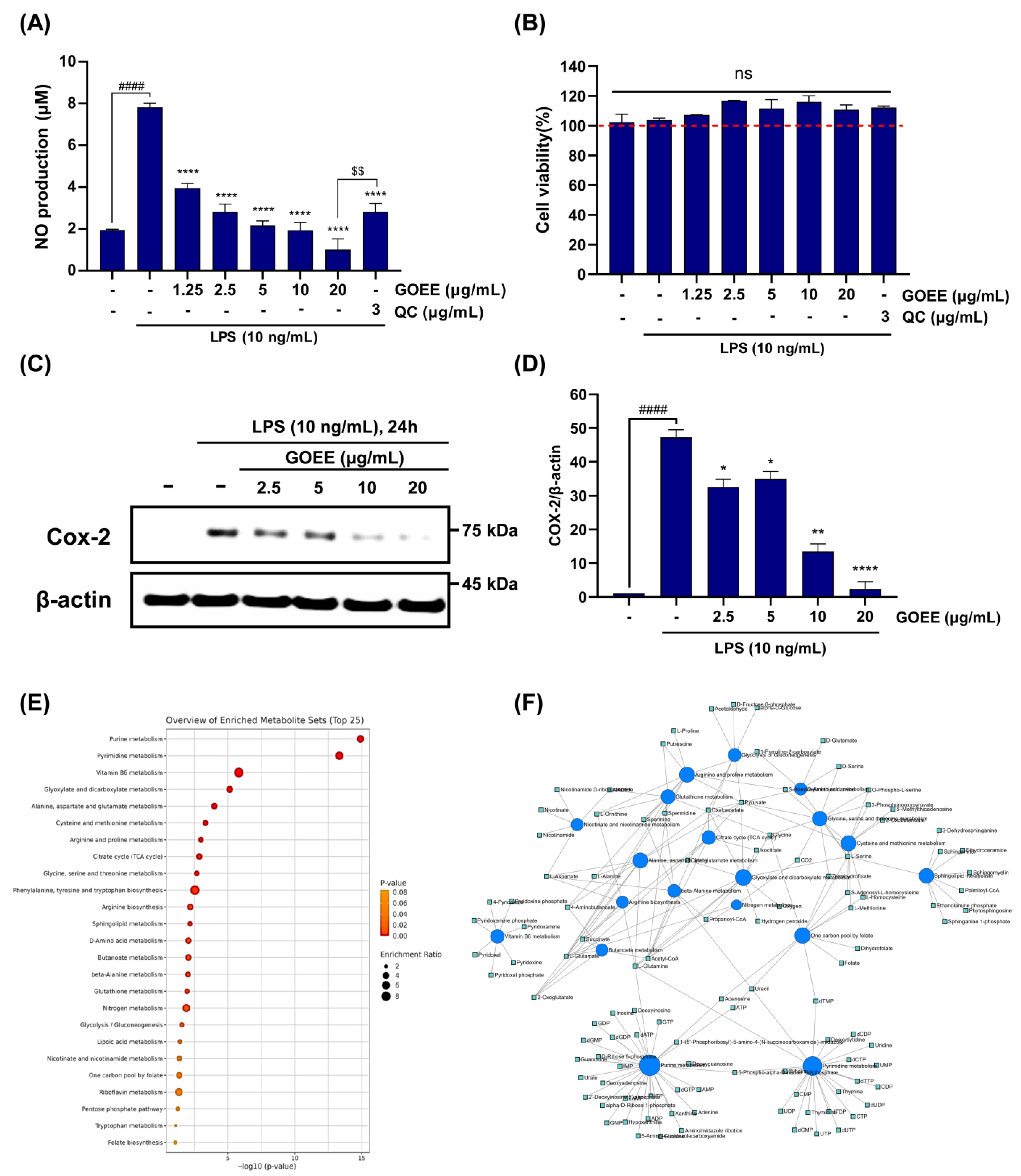 2 for 24 h. Subsequently, the cells were divided into the following experimental groups: (1) Control (Vehicle), (2) LPS alone (10 ng/mL), (3) GOEE + LPS, and (4) Positive control (3 μg/mL) + LPS. Cells were exposed to various concentrations of GOEE (1.25−20 μg/mL), and the cells were stimulated with LPS (10 ng/mL) and incubated for another 24 h. After the 24 h exposure to samples, equal volumes of the cell culture medium and Griess reagent were combined in a 96-well plate and incubated for 10 min. Then, the absorbance was measured at 540 nm using a Synergy™ HTX microplate reader (Agilent Technologies Inc.).