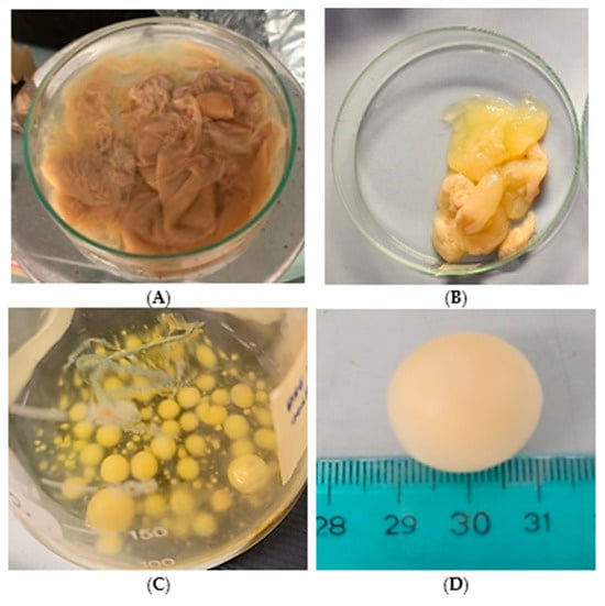 Since Pseudomonas sp. ef1 is a marine bacterium, BC production was also examined in artificial seawater supplemented with 1.5% glucose at 22–24 °C, both in static and shaking conditions. Cultures were started from those grown in yeast extract (1%) or nutrient broth liquid medium (as described in the Material and Methods). After 5–6 days of incubation under shaking at 100 rpm, the formation of spherical flocculates was observed (Figure 1C,D), with sizes ranging from 3 to 20 mm in diameter. Under these media conditions, BC production under static incubation was not observed. The water content was estimated to be 79%.