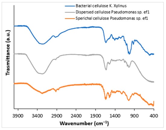 FTIR spectra of bacterial cellulose (BC) produced by K. xylinus (blue line) and Pseudomonas sp. ef1 (gray and orange lines). The gray line represents the spectrum of sheet-like BC, while orange line corresponds to spherical-shaped BC.