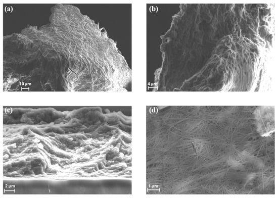 SEM images reveal that the spherical BC produced by Pseudomonas sp. ef1 (Figure 3a,b) consists of filamentous structures with diameters below 1 µm, similar to those observed in BC synthesized by K. xylinus (Figure 3d). However, the fibrous network of Pseudomonas sp. ef1 appears less uniform and less distinctly organized compared to the well-defined and homogeneous architecture of K. xylinus-derived BC.