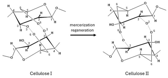 In some cases, cellulose II has also been found in nature [32,33,34]; unlike cellulose I, which features parallel chains, cellulose II is characterized by an antiparallel chain arrangement and a monoclinic crystal lattice [31].